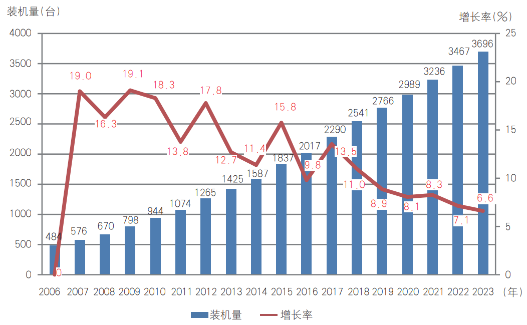圖1 2006~2023年中國內地機組式柔性版印刷機裝機量及增長率