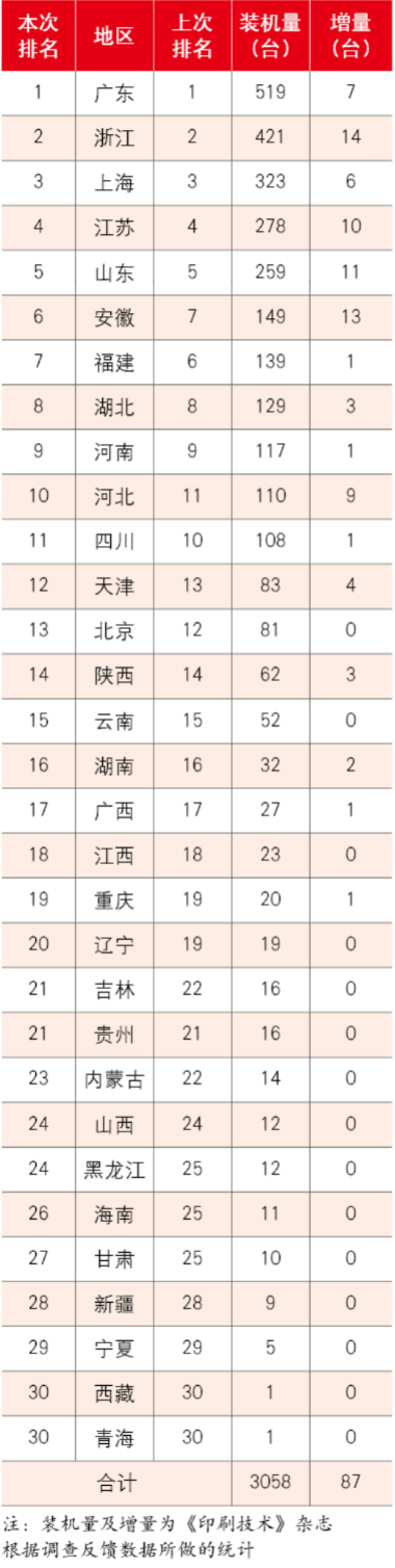 在本次統計的3696臺機組式柔性版印刷機中,除638臺設備的安裝地區不明確外,其余3058臺設備均有明確地區分布,各地區的裝機量、增量及排名情況見表2。