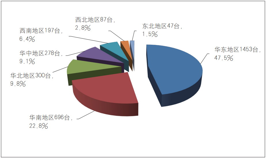 如圖3,從傳統地理分區來看,華東地區排在首位(增量為54臺),華南地區位居第二(增量為9臺),接下來依次是華北地區(增量為13臺)、華中地區(增量為6臺)、西南地區(增量為2臺)、西北地區(增量為3臺)、東北地區(增量為0臺)。