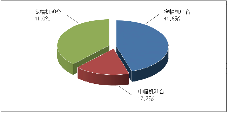 在本次調查統計的229臺增量機組式柔性版印刷機中,122臺設備提供了明確機型。在提供明確機型的機組式柔性版印刷機中,窄幅機為51臺,占裝機增量的41.8%;中幅機為21臺,占裝機增量的17.2%;寬幅機為50臺,占裝機增量的41.0%,如圖4所示,窄幅機和寬幅機占據絕大部分市場。