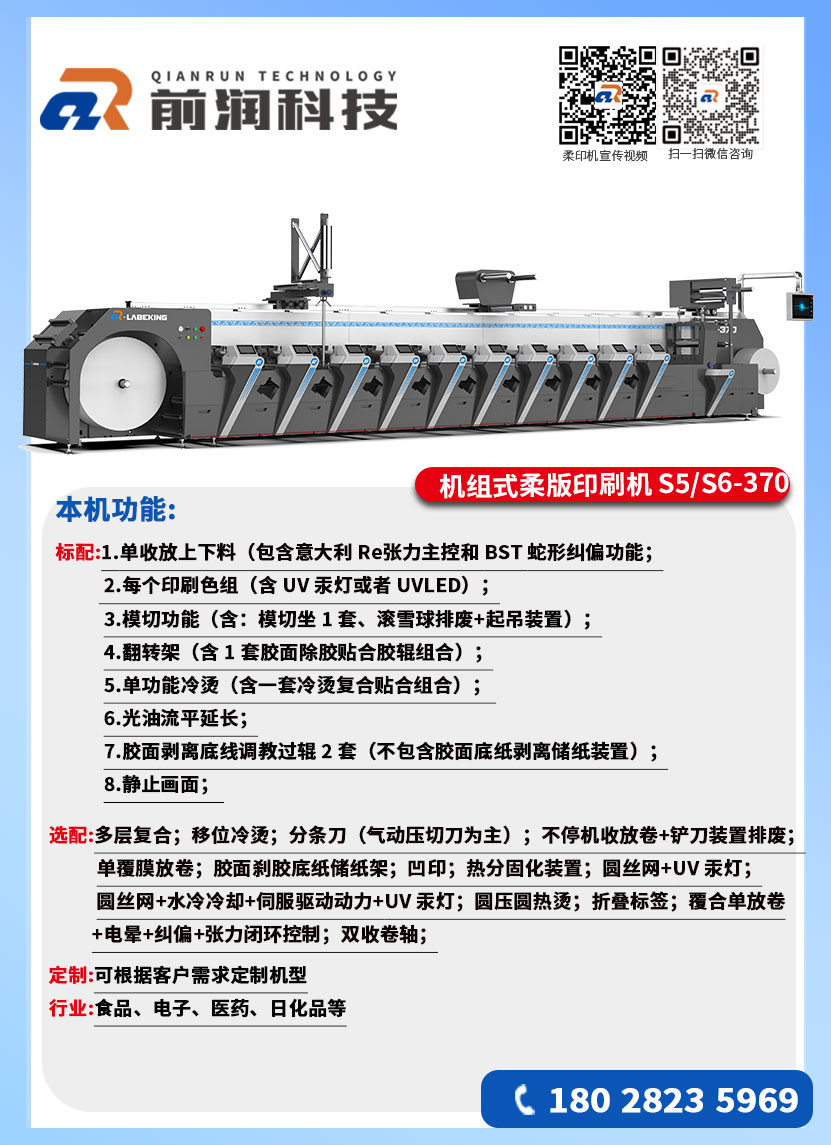 3、印刷或傳墨壓力調節快捷方便:印刷輥采用承載式,換輥時無須調節壓力,特殊作業時最多微調。 Printing or ink transfer pressure adjustment is quick and convenient: the printing roller adopts load-bearing type, and there is no need to adjust the pressure when changing the roller. At most, fine-tuning is required for special operations. 4、智能不停機系統:可選配不停機收放卷系統,支持手動/自動接紙,提高生產效率;全視覺自動套印系統,實現自動套印和數據保存,返單時可一鍵調取,自動套準。 Intelligent non-stop system: optional this system, support manual/automatic paper connection, improve production efficiency; full visual automatic overprinting system, realize automatic overprinting and data storage, and can be retrieved with one button when returning the order, and automatically register. 5、多功能印刷:柔版印刷為主,支持冷燙、覆膜、除膠、多層標簽、折頁標簽、在線品檢、模切等工藝,可選配絲印、噴碼、凹版等聯機功能。 Multifunctional printing: mainly flexographic printing, supporting cold stamping, lamination, Glue removal, multi-layer labels, folding labels, online inspection, die-cutting and other processes, and optional online screen printing, inkjet printing, gravure, etc. |