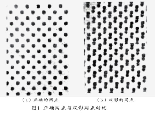 當(dāng)通過100倍的放大鏡或顯微鏡觀察印品時,印刷品上15%~25%網(wǎng)點區(qū)域會顯示出明顯的雙影問題。其表現(xiàn)是,在一個深色點子旁邊出現(xiàn)一個淺色點子或者是深色點子與淺色點子相互搭疊(見圖1)。其發(fā)生機理可以這樣解釋:由于油墨圖文從橡皮滾筒轉(zhuǎn)移到紙張上的過程中未能完全轉(zhuǎn)移,在橡皮布上留下了一個淺色的可印刷圖像。在下一印刷周期中,印版上轉(zhuǎn)移過來的新鮮的油墨圖像未能與橡皮布上殘留的圖像精確對準,轉(zhuǎn)移到下一張紙上的圖像就會形成雙影。這是網(wǎng)目調(diào)印刷的一個令人煩惱的問題。因為每一印張上的雙影情況都不相同,從而導(dǎo)致色彩濃淡無規(guī)律的變化。